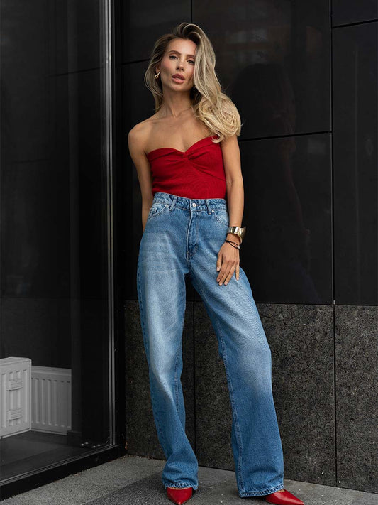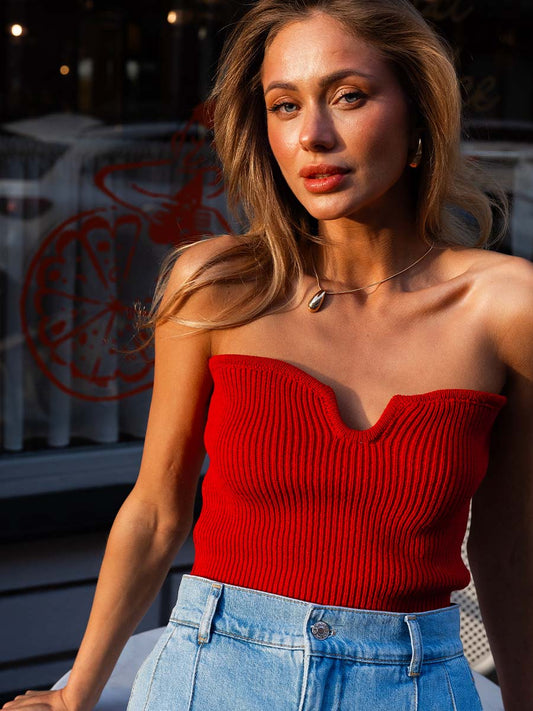 Red knitted top with open shoulders