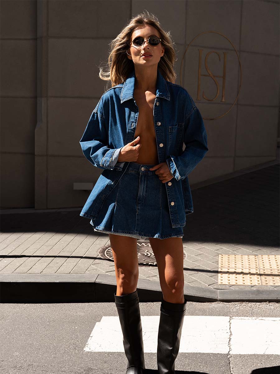 Skirt-shorts made of high-quality denim. It is decorated with horizontal folds that create an interesting three-dimensional effect and has a bottom layer of cotton fabric. Fastens with a zipper and a button.
