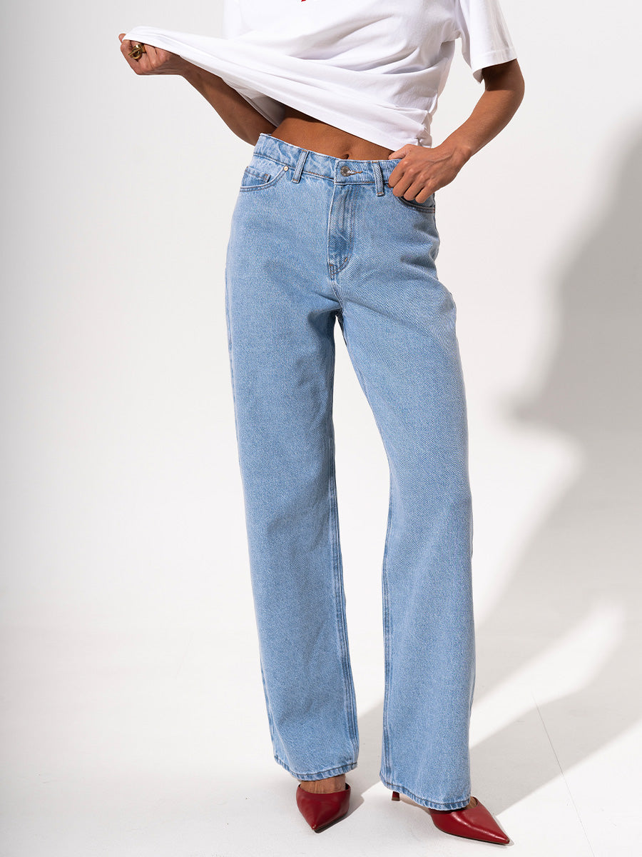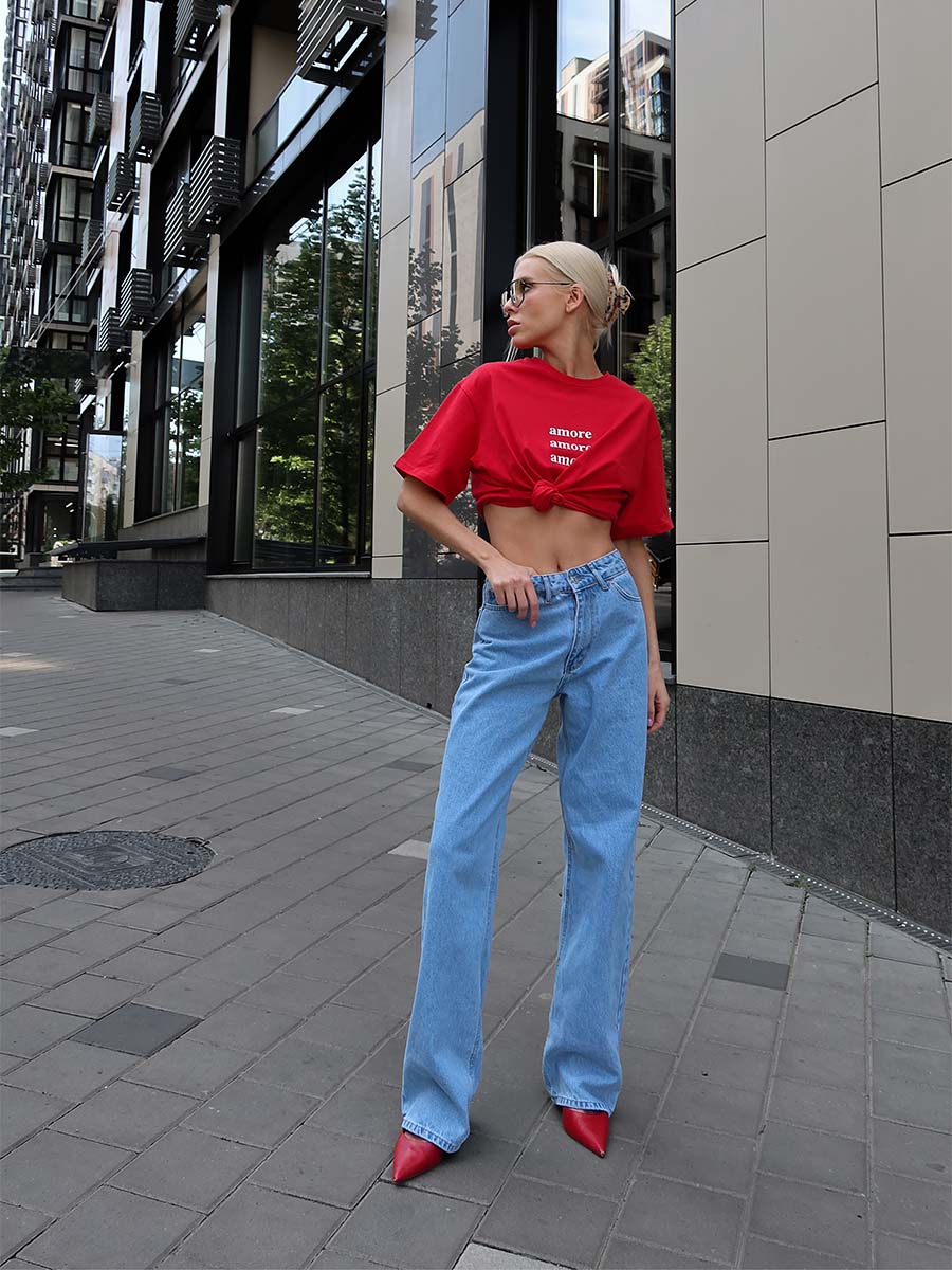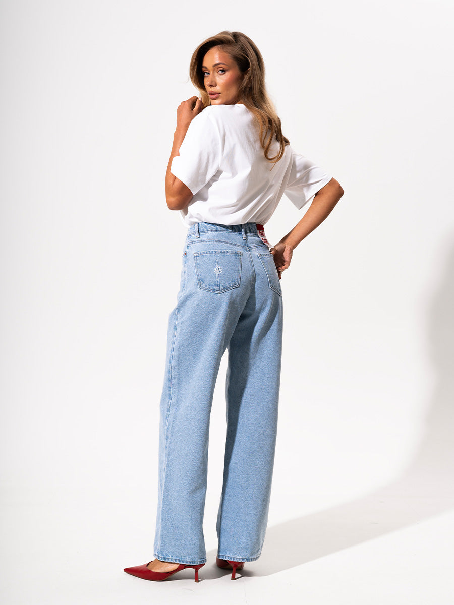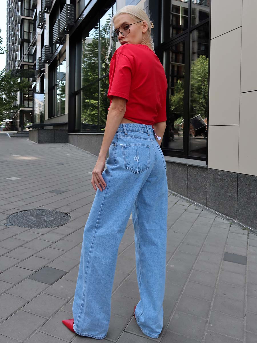 Jeans made of high quality denim. They have a loose palazzo cut, which adds maximum comfort and a trendy look. The product is decorated with embroidery in the form of a ONE BY ONE brand element on the back pockets and a unique tag with the inscription HEY GIRL. A stylish solution for any occasion - from everyday walks to evening events. Perfectly combined with T-shirts and tops, as well as shirts or jackets.