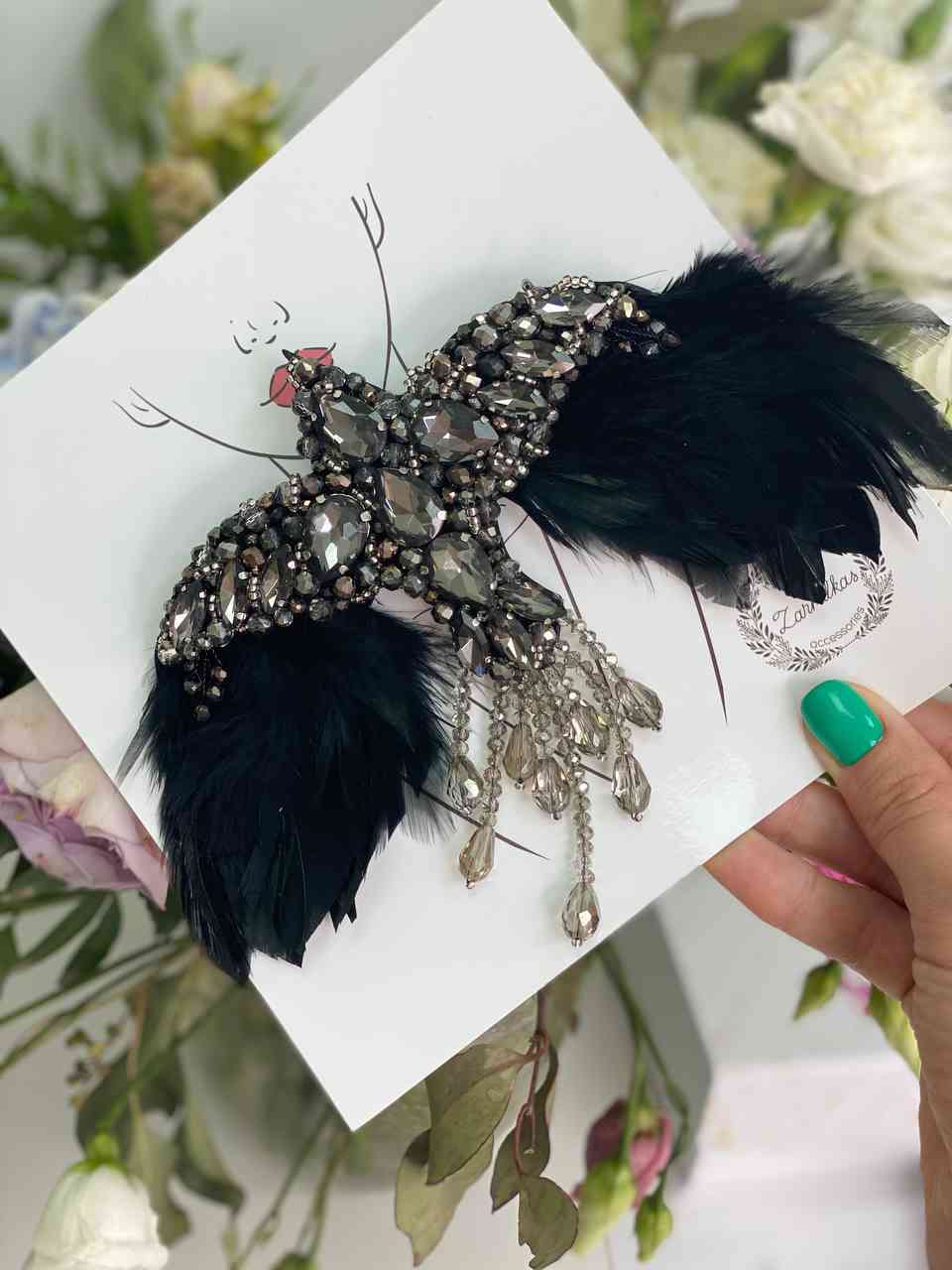 The width of the brooch excluding feathers is 12 cm, including feathers - 24 cm. The length of the brooch is 12 cm."