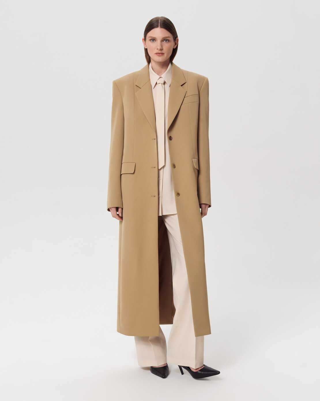 This oversized jacket-coat features a straight-cut design. It has a high shoulder line, wide loose sleeves with shoulder pads, and a slit at the back and rounded sides. The front of the coat has two pockets with flaps and a two-button fastening.
