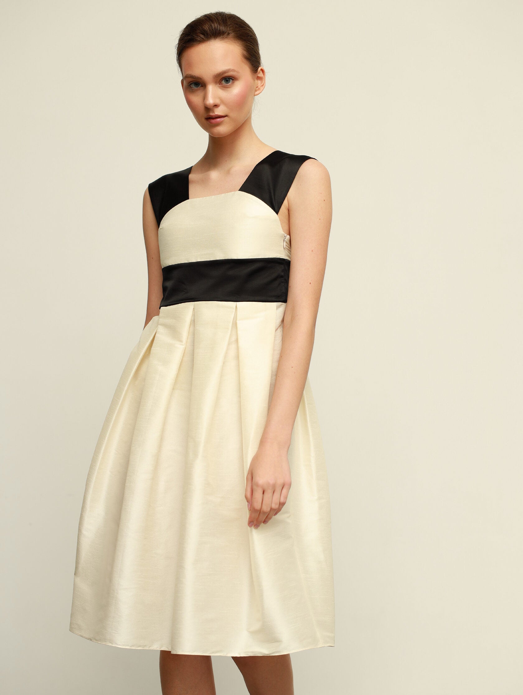 Made in a milky shade and decorated with black satin.