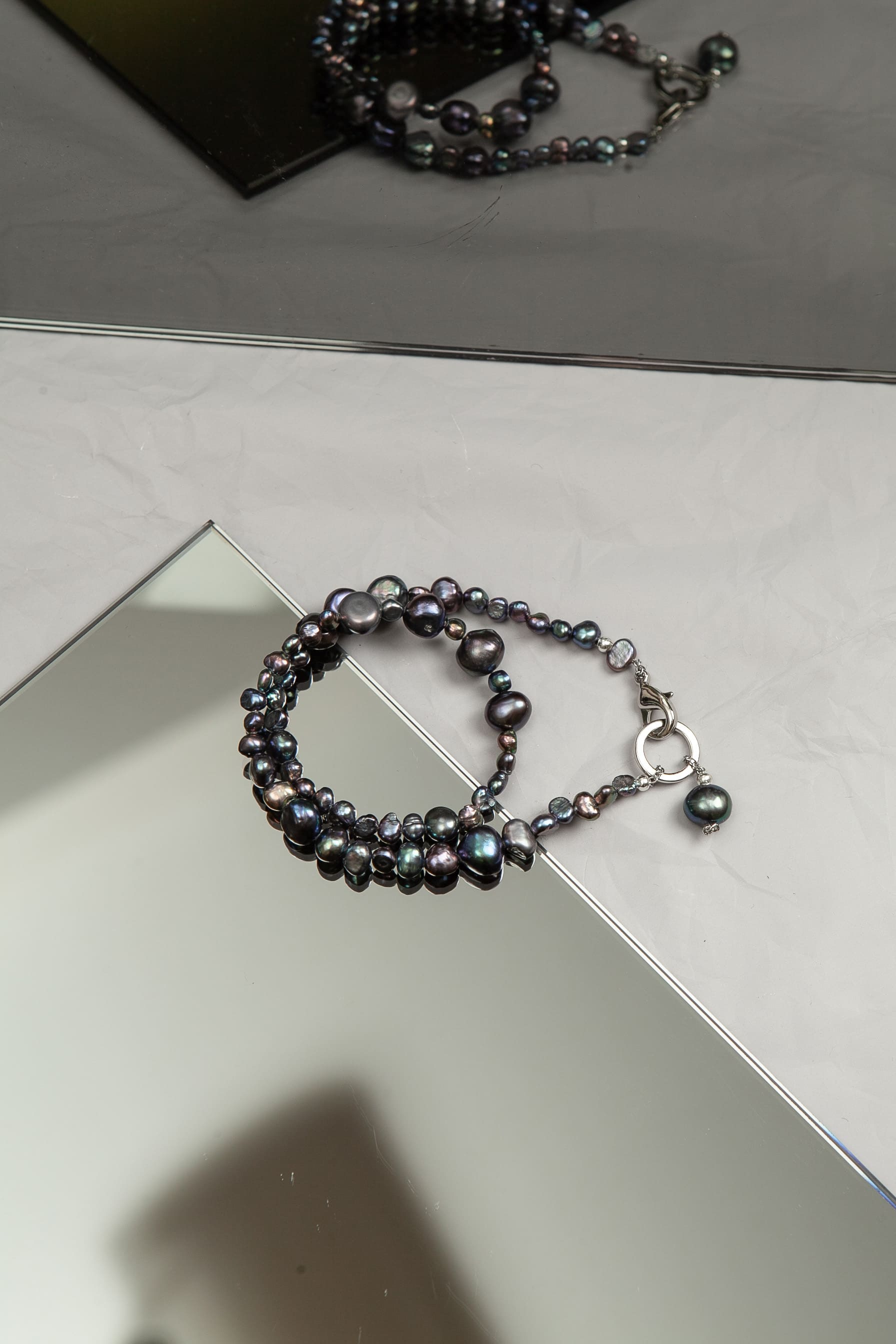 A string of pearls is twisted in two rows around the hand, fixed with a carabiner.