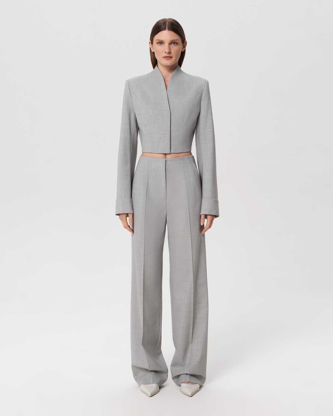 Light-Grey high-rise wide trousers with zip, inside button, and hook. Has front welt pockets.
