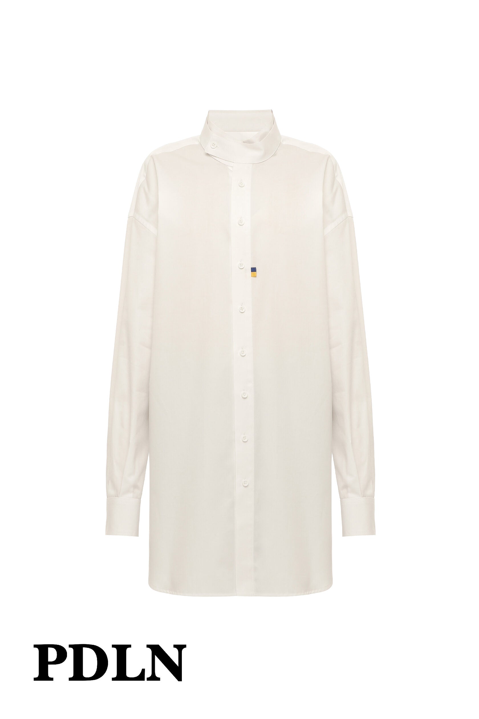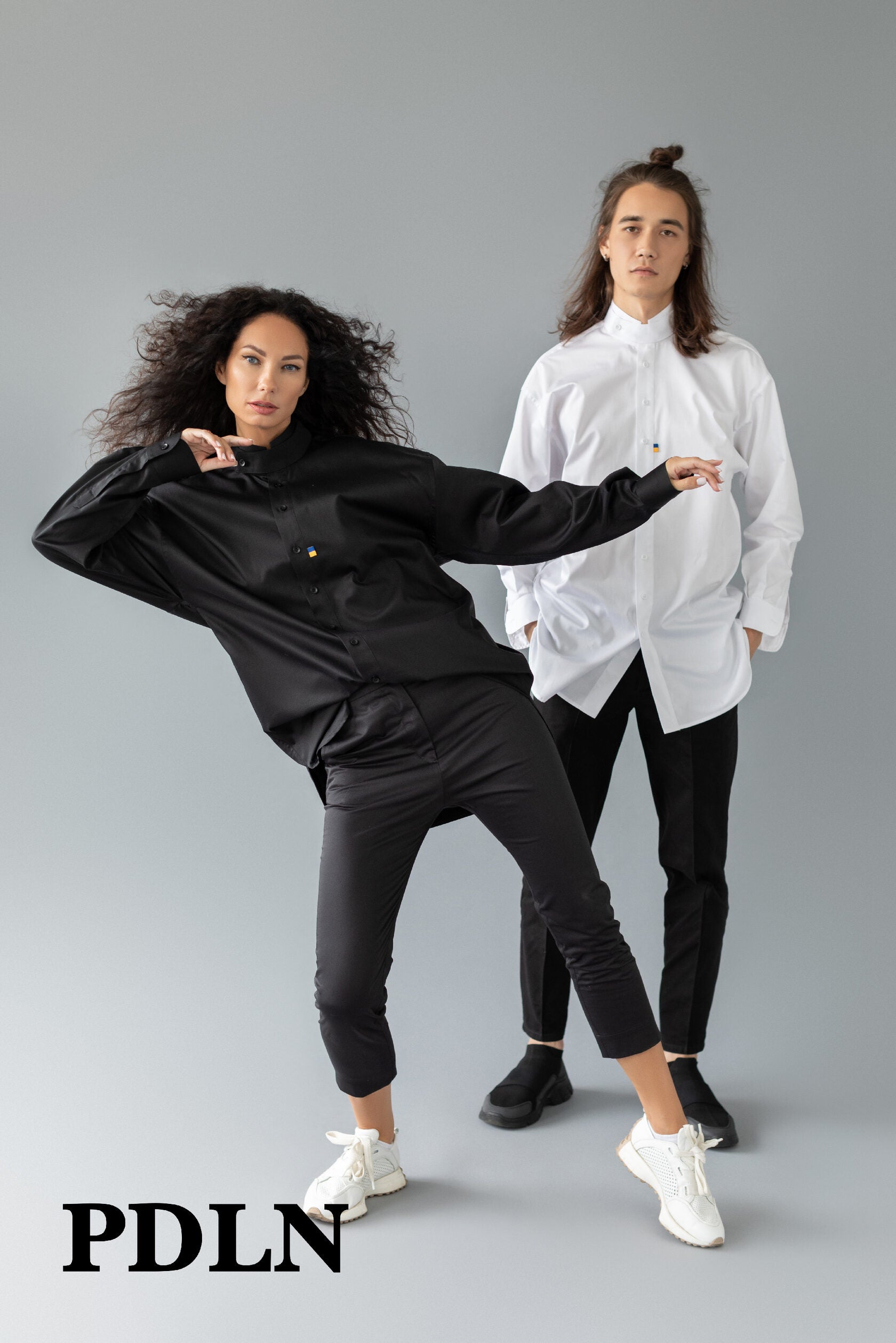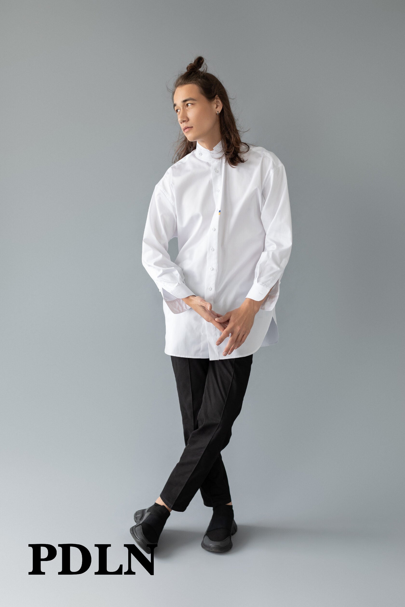 Unisex oversized shirt with a button-up closure down the center. Double stand-up collar with a button on the right. Made in Ukraine.