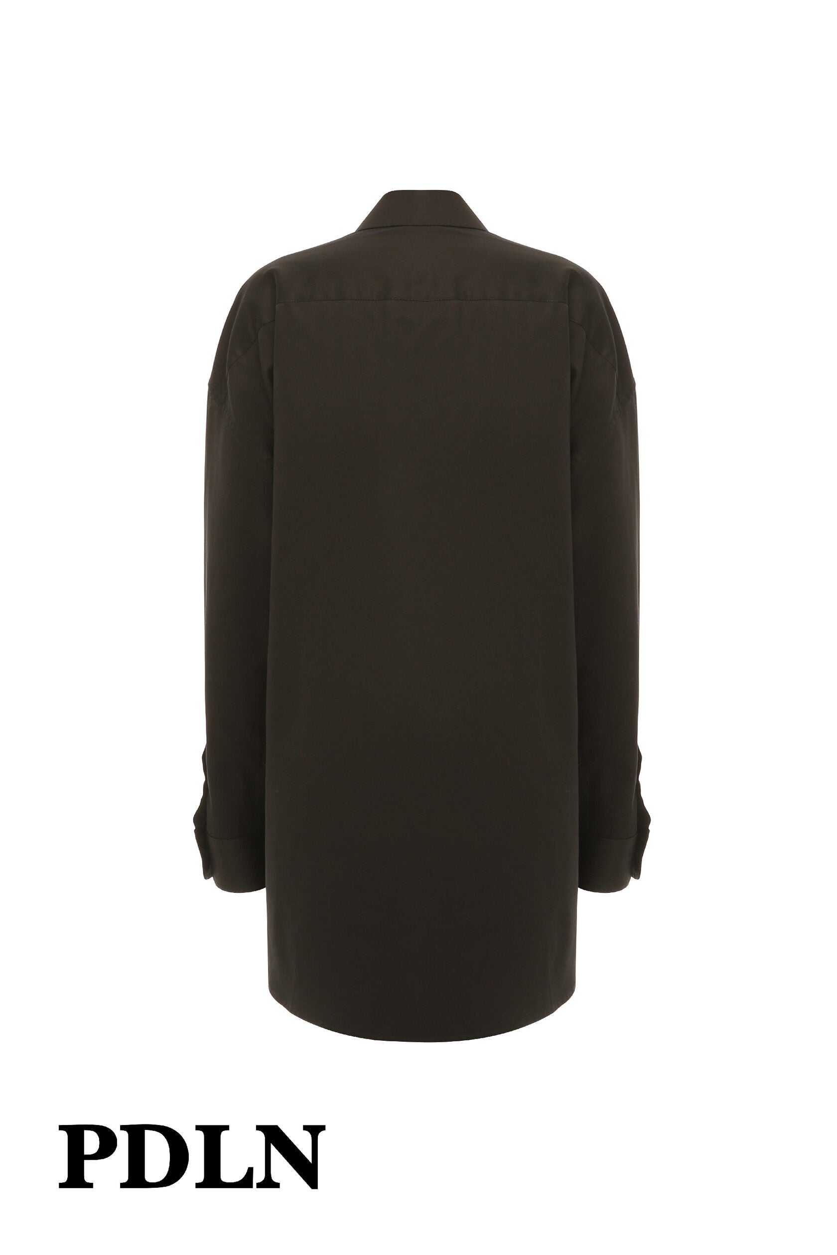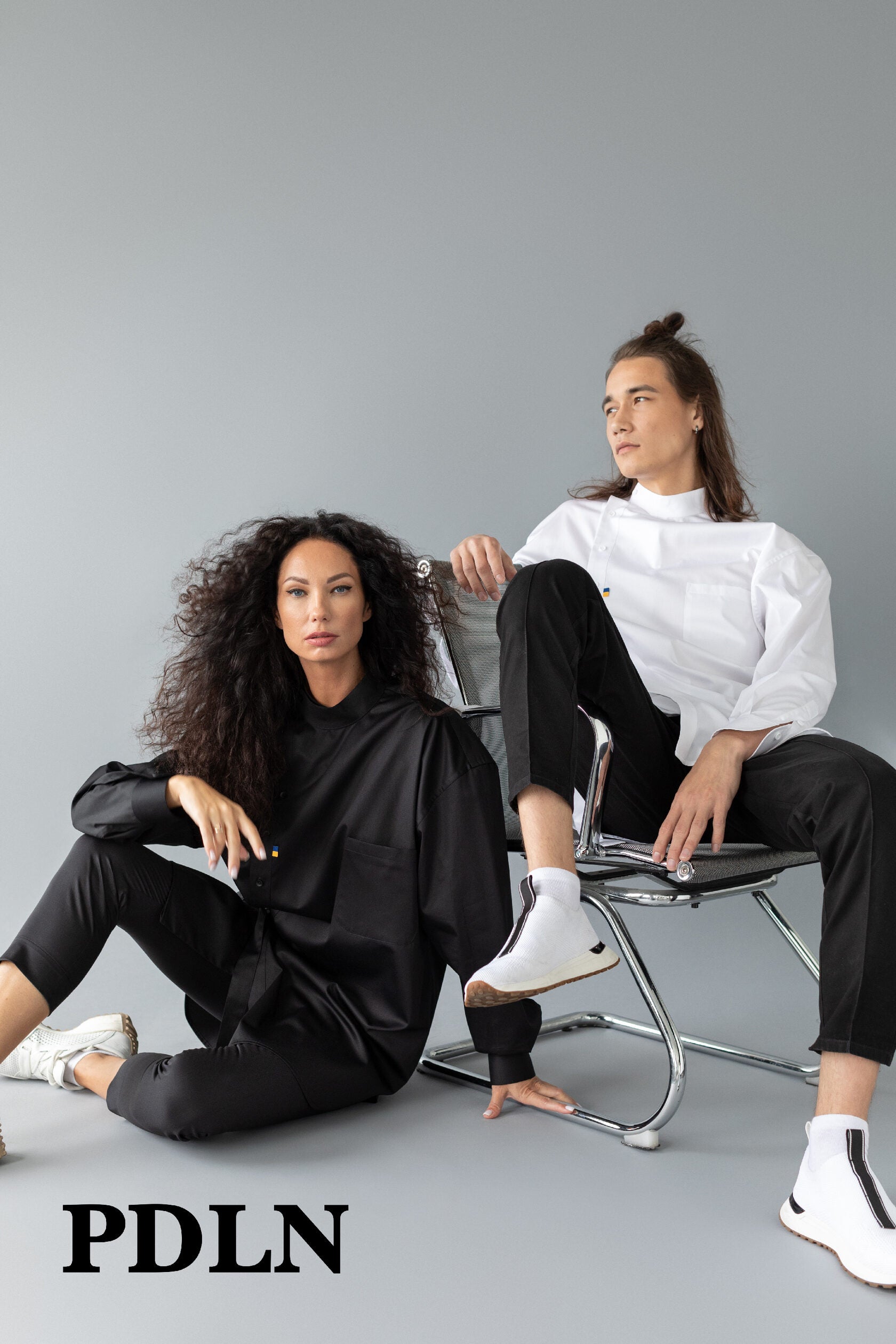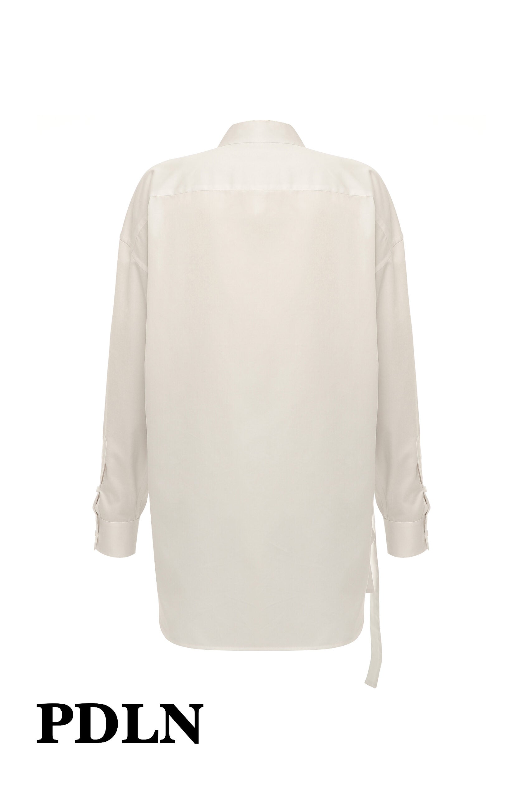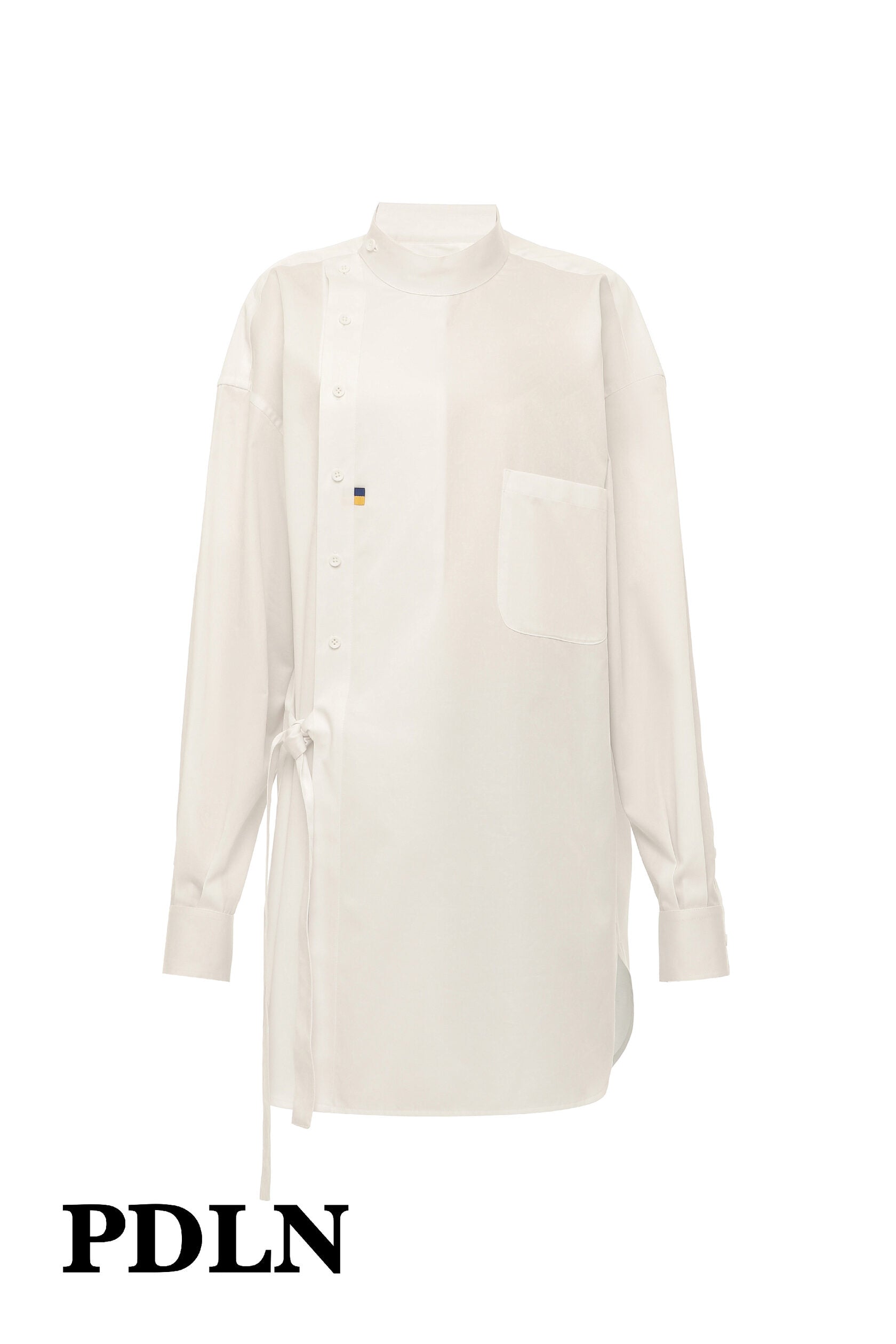 Unisex oversized shirt with a buttoned closure offset to the right and a tie at the waist. Front pocket on the left. Stand-up collar with a button on the right. Made in Ukraine.