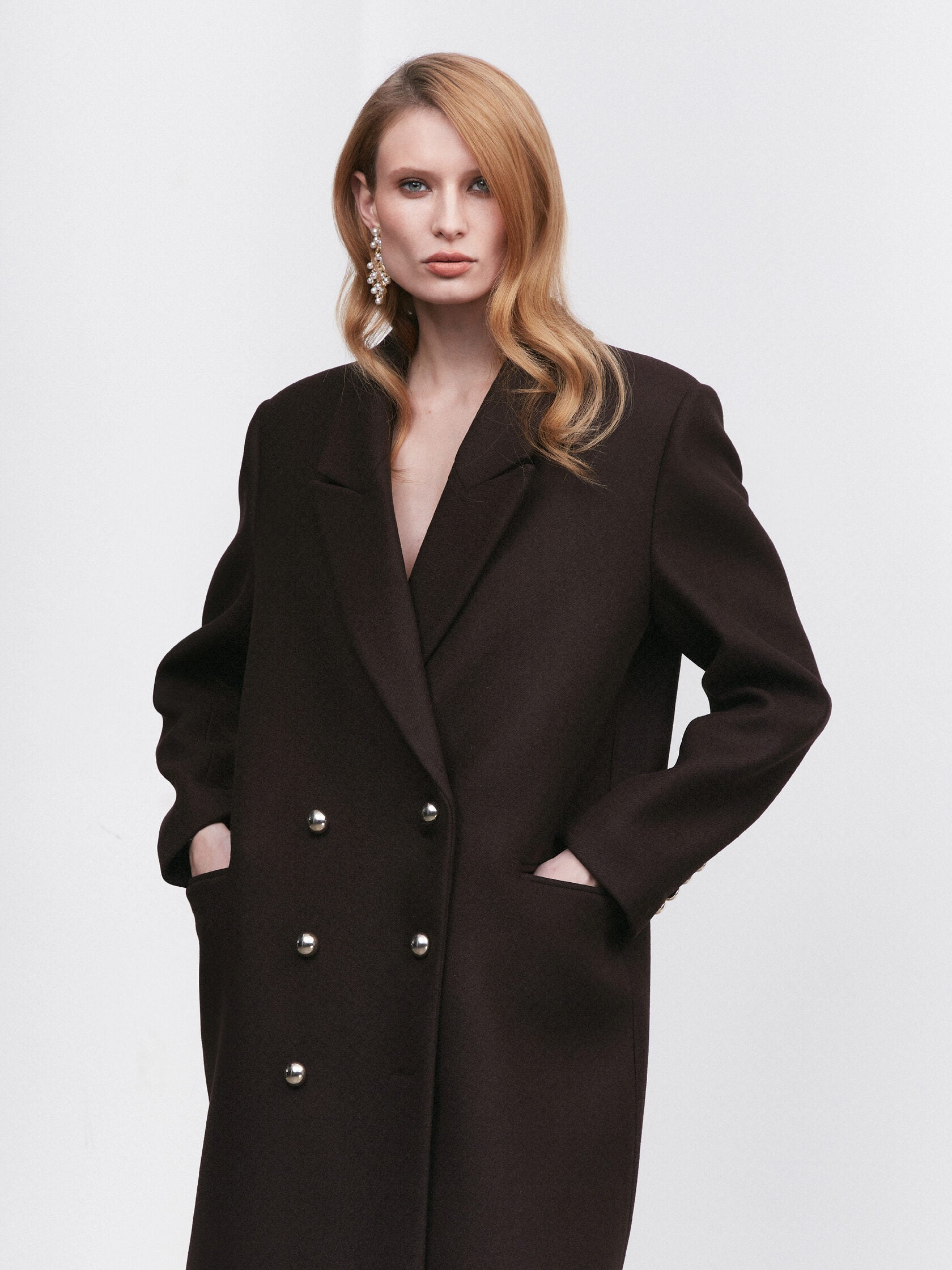 Long burgundy wool double-breasted double-breasted coat lined with six metal buttons