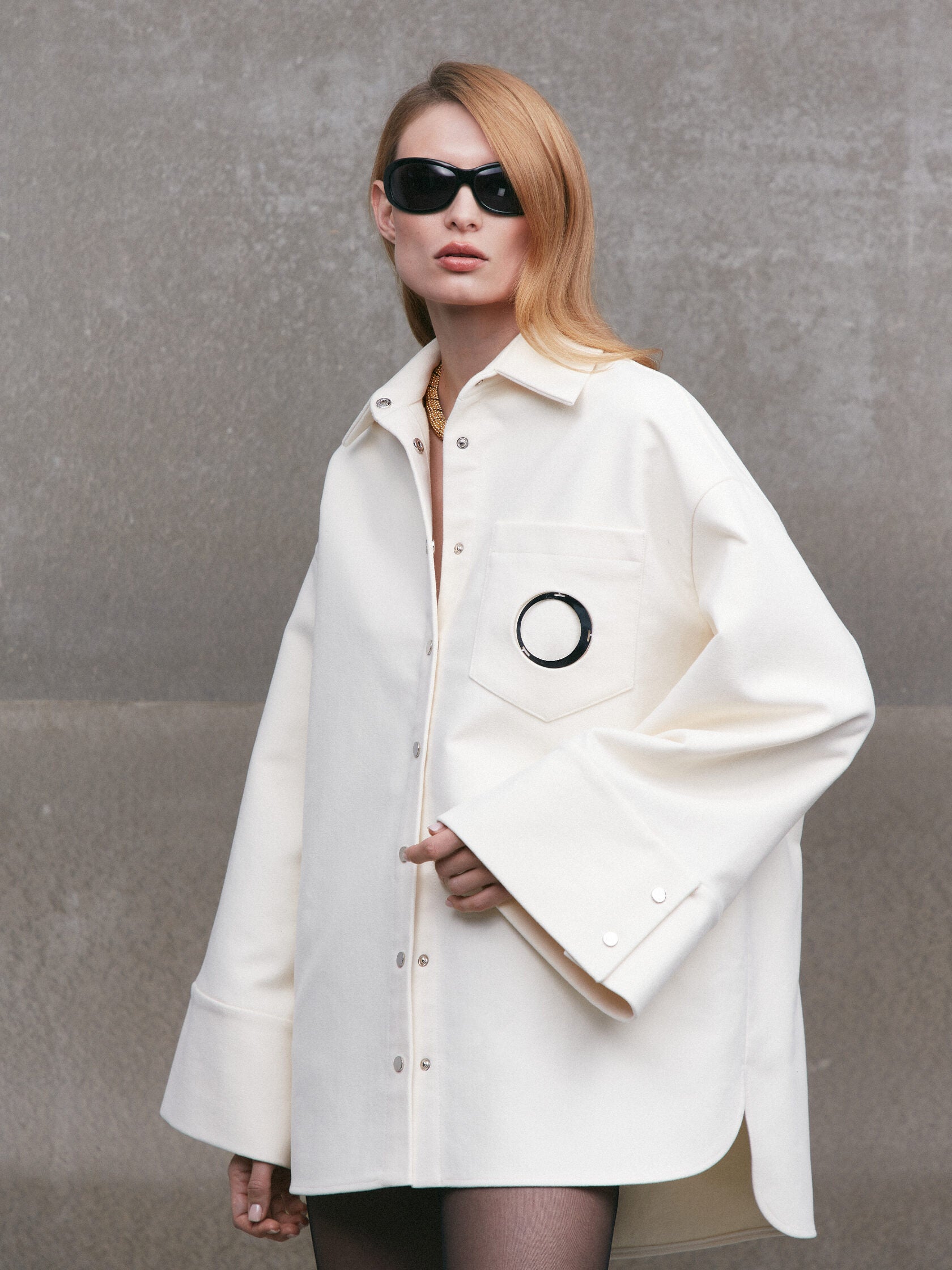 Wide woollen shirt with metal ring on the pocket